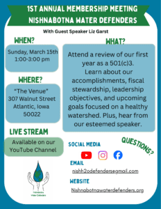 Join the meeting virtually on March 15th via the Nishnabotna Water Defenders YouTube page. We look forward to seeing you there.